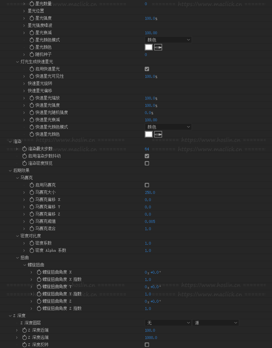 - 结合噪波:设置最多 3 层不同噪点的密度。散射噪点可以是三种不同的类型:体积噪波、螺旋噪波和反向 FBM 噪声。每个噪点都可以使用 Evolution 滑块进行微调和动画处理。