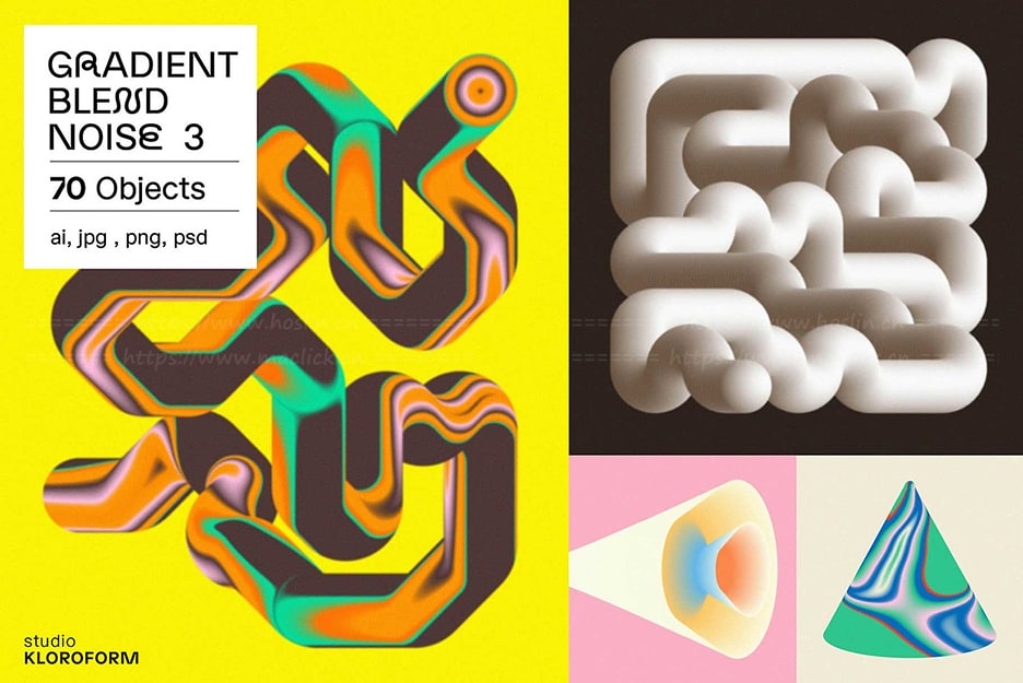 红森林 » 【图片素材】70款潮流创意怪诞抽象迷幻渐变立体几何图形艺术海报设计ai素材 Gradient Blend Noise 3